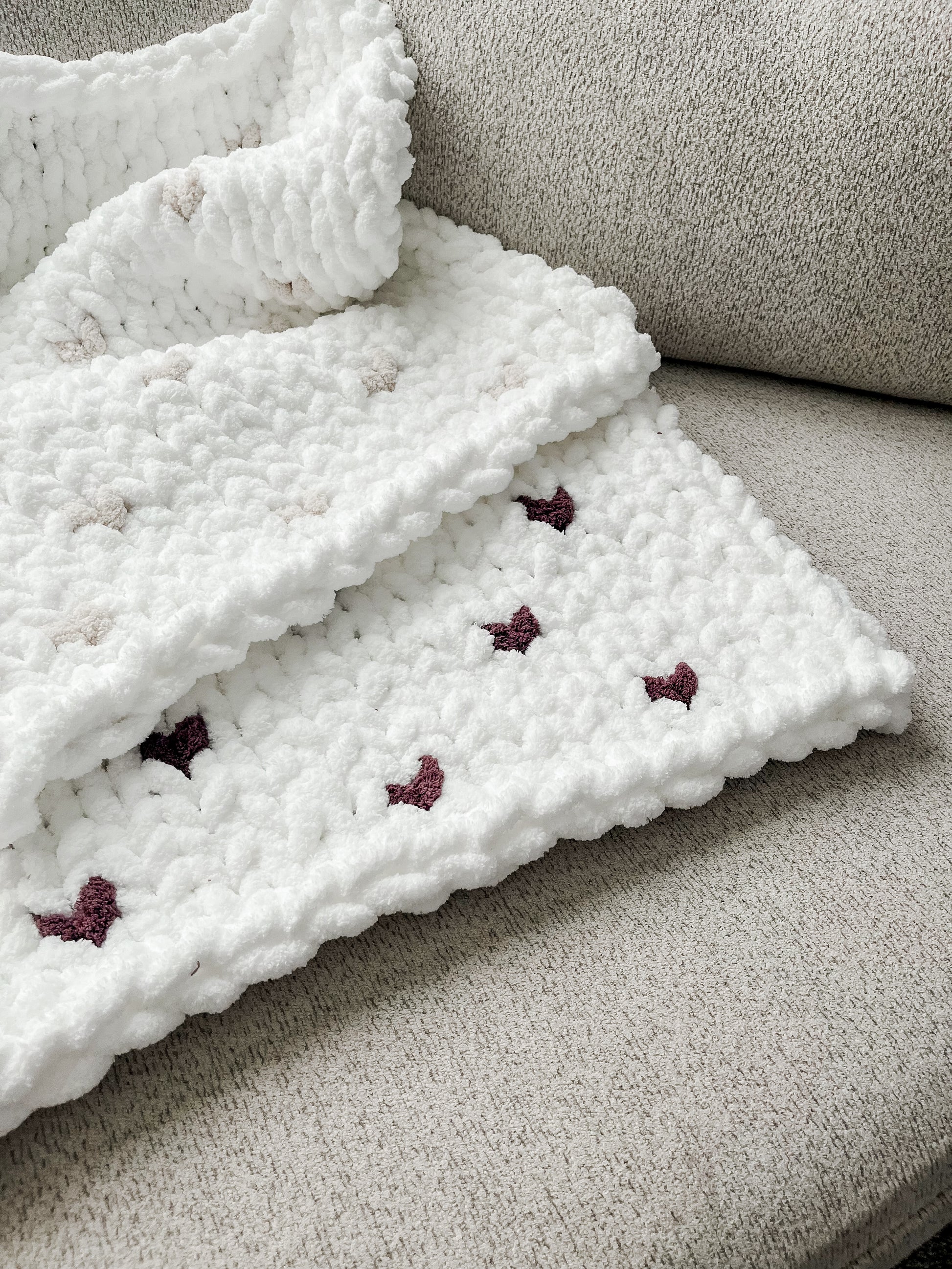 Our cozy throw blanket is handmade with super soft chunky chenille yarn. Part of our new Mommy & Me collection, this cute twist on our chunky knit blanket features a heart pattern. This plush, soft blanket is perfect for cozying up with your mini-me, as well as a great accent piece for your living room or bedroom. This blanket also makes for the most perfect thoughtful gift.