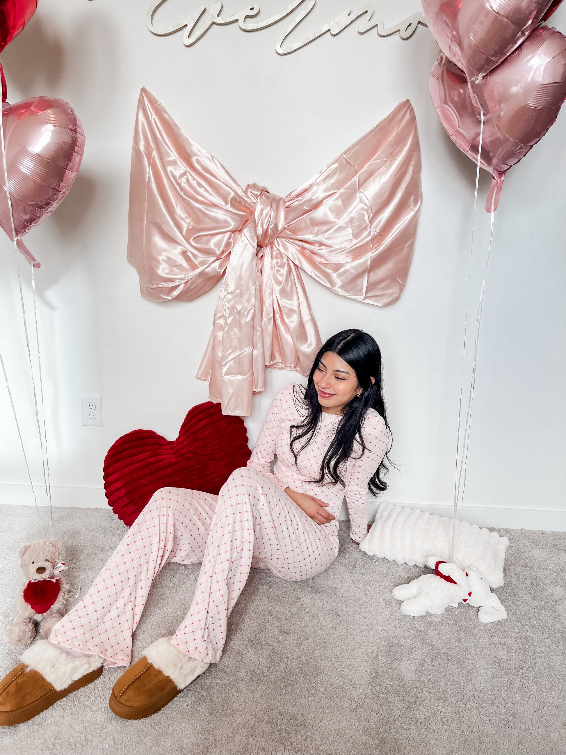 Design with a heart print and delicate picot lace trim adding a beautiful detail to the set. So soft and lightweight, adding the perfect touch to an adorable lounge set.